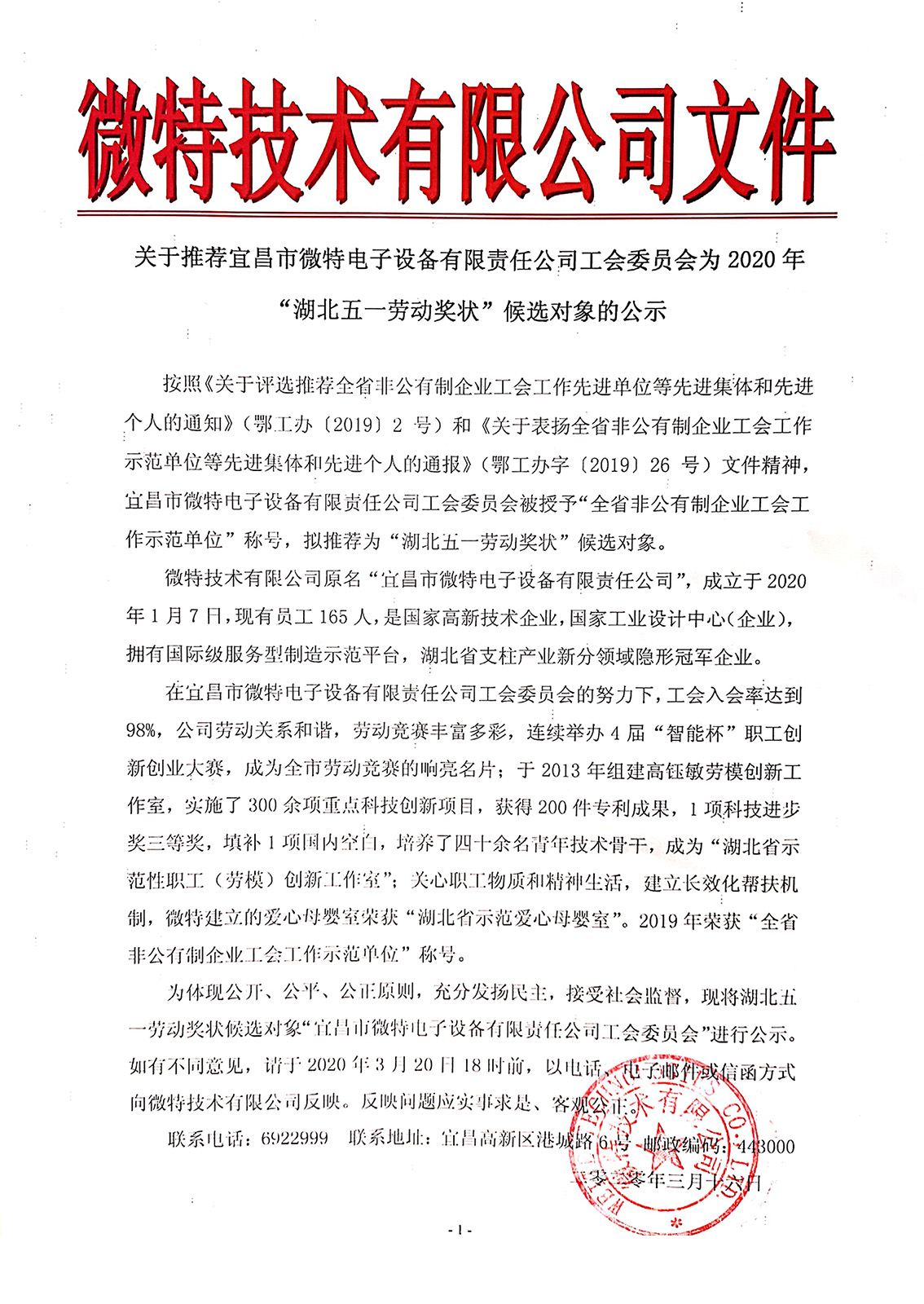 2020年“湖北五一勞動獎狀”候選對象的公示